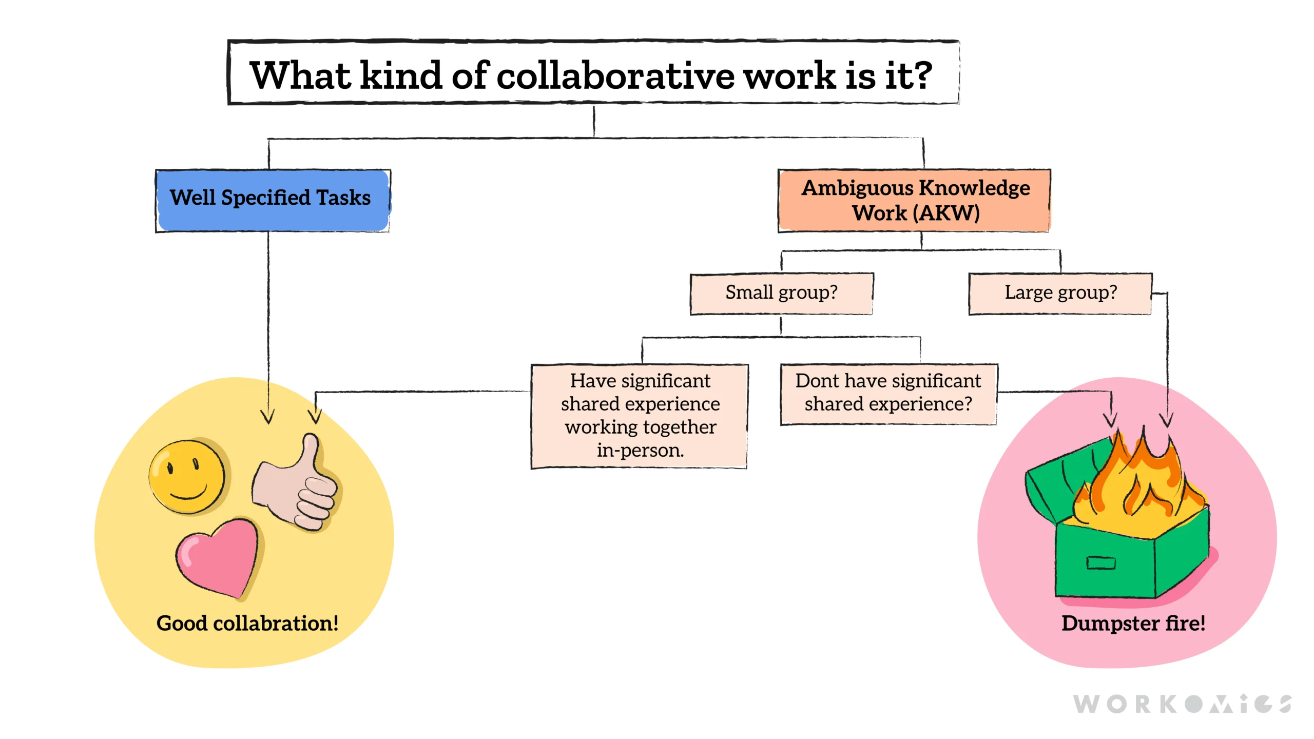 Since the pandemic began, our team’s experience with virtual collaboration has been decidedly mixed. It’s fine when the output can be precisely specified in advance; where deliberate over-communication means that everything turns out as anticipated. The challenge comes with collaborating on something we call Ambiguous Knowledge Work (AKW) — the messy job of synthesizing research, finding a creative solution to a problem, or designing a new program. The ambiguity in AKW is not what we’re making (it’s usually a PowerPoint deck, let’s be real), but in figuring out how to make abstract ideas relevant and resonant. At the outset, we can’t really describe what good looks like; there are many possible good outputs, and many bad ones too. Somehow, we need to get everyone working together to build the same thing, even when we don’t know what that thing is.