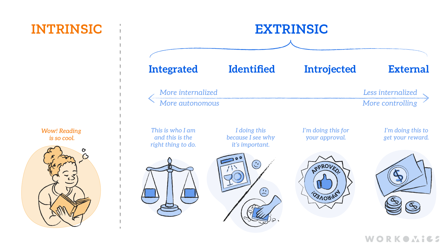 But in self-determination theory, extrinsic vs. intrinsic motivation is not a simple dichotomy. Rather, extrinsic motivation comes in four different flavours: external, introjected, identified, and integrated.
